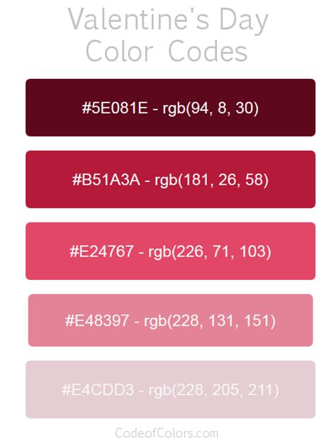 Valentine Day Color Code - In each colored box you will find the hex. Download valentine’s day color scheme consisting of #b61059, #d72058, #ee9e1b, #dc1e1c, #c51313 and #b30a14. Discover pastel and canary yellows, beiges, peaches, light pinks, lime greens, and pale purples in these delicate valentine’s day color palettes. Pink is the english word for a color often called rosa in italian, german and spanish..